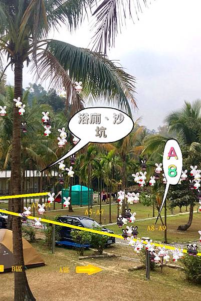 A區有規劃以椰子樹分線的營位共10帳,但營位真的很大所以不會帳帳相連,每個區塊之間鋪上磚塊及圓柱磚,所以即使下雨也大太會踩泥,也有提供黑色膠墊來保護草地,在中間區塊前有洗手檯、有大棚架遮陽、雨,晚上也有燈條照明,所以非常的舒適啦!